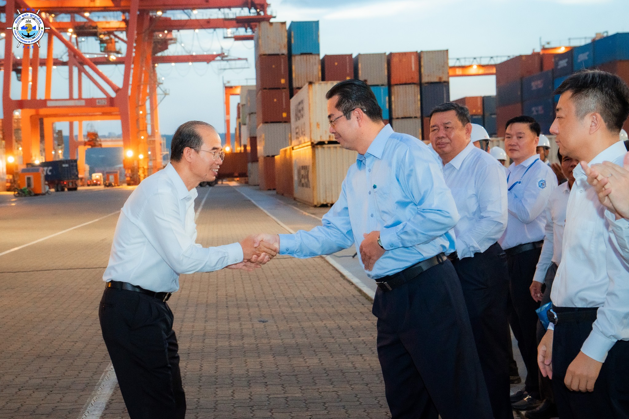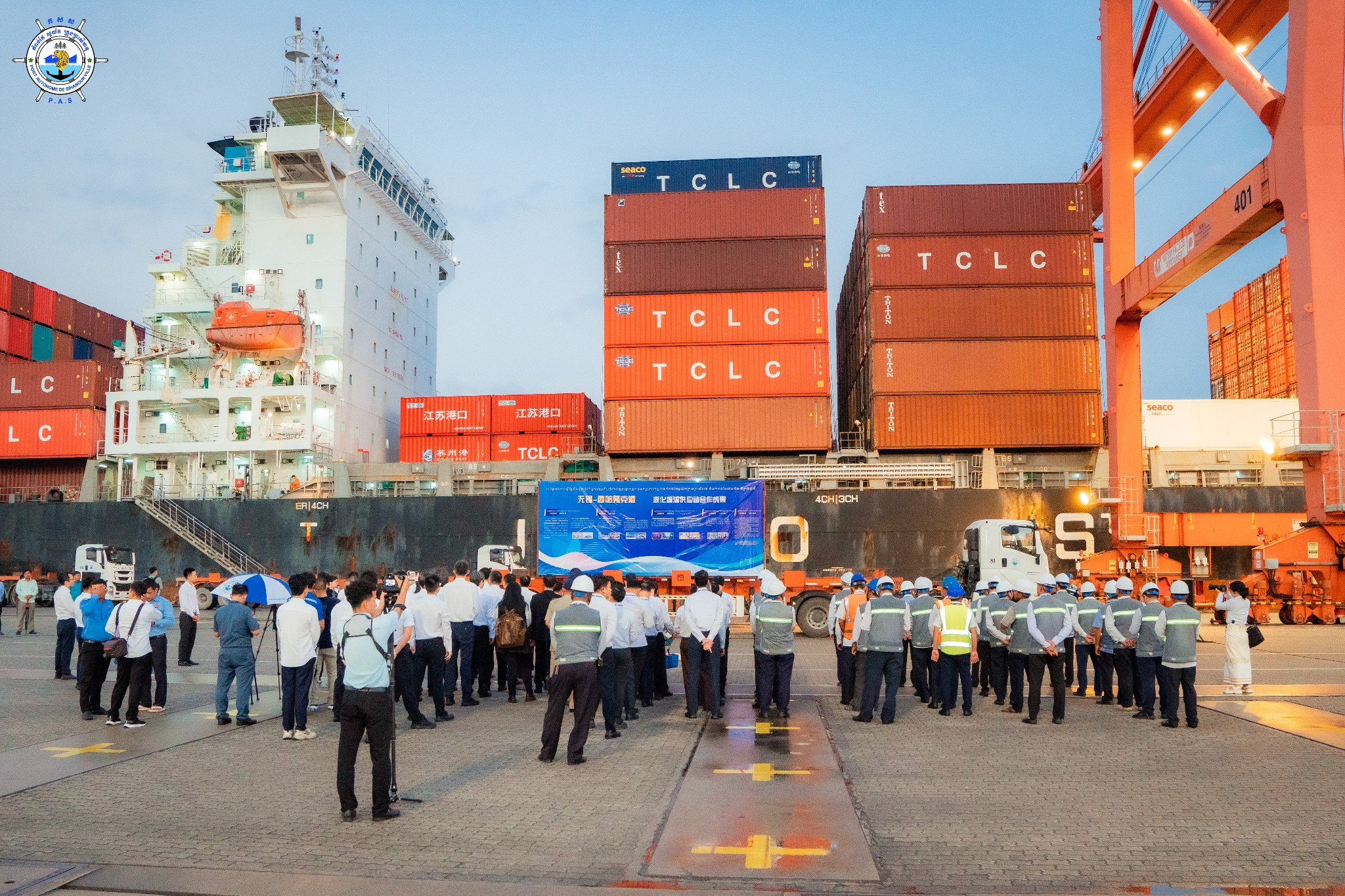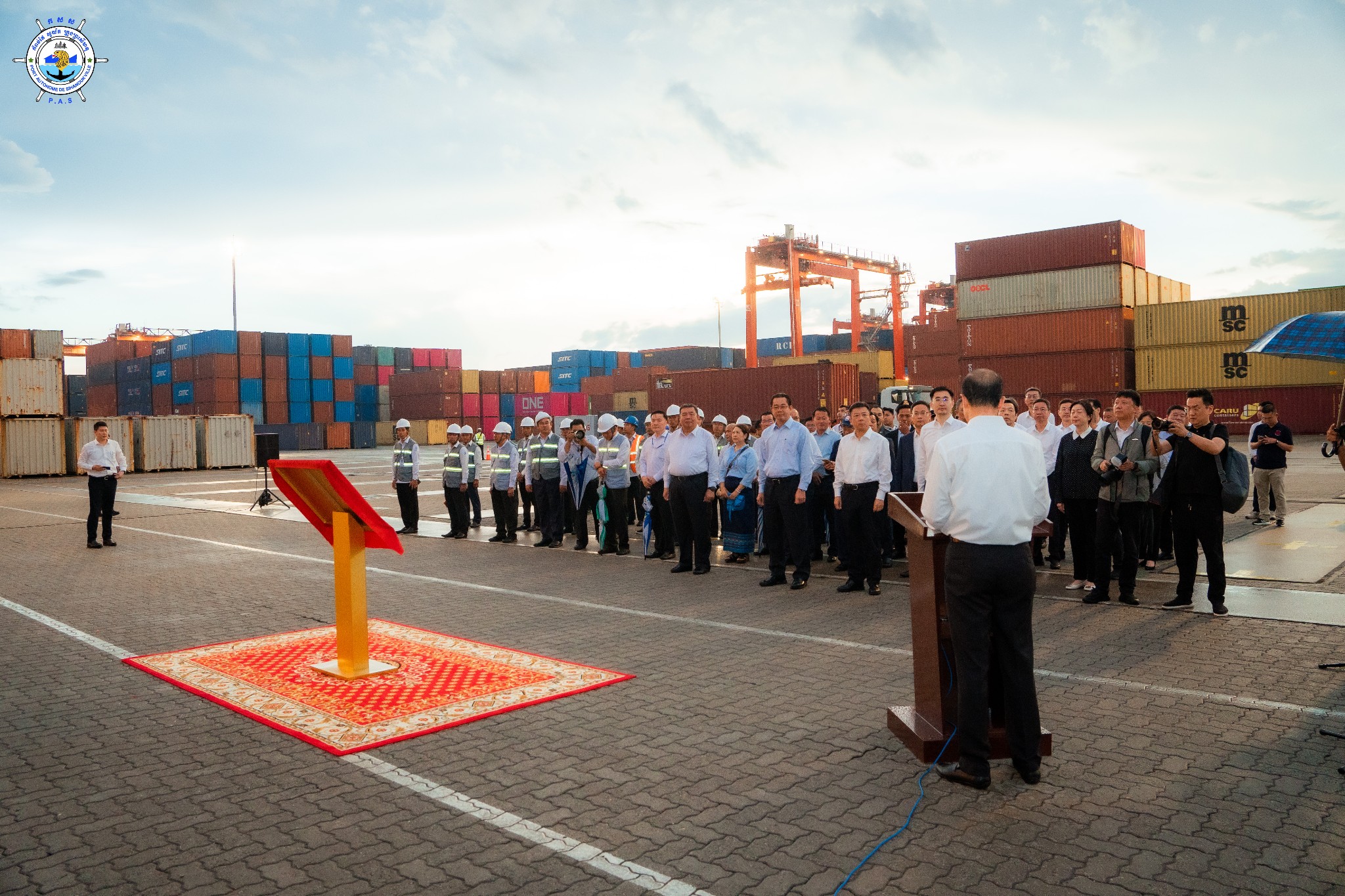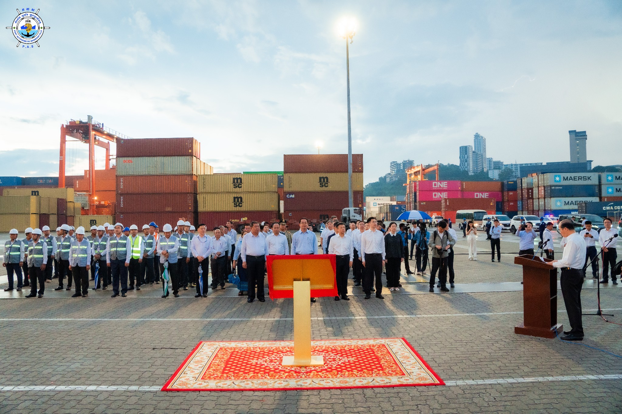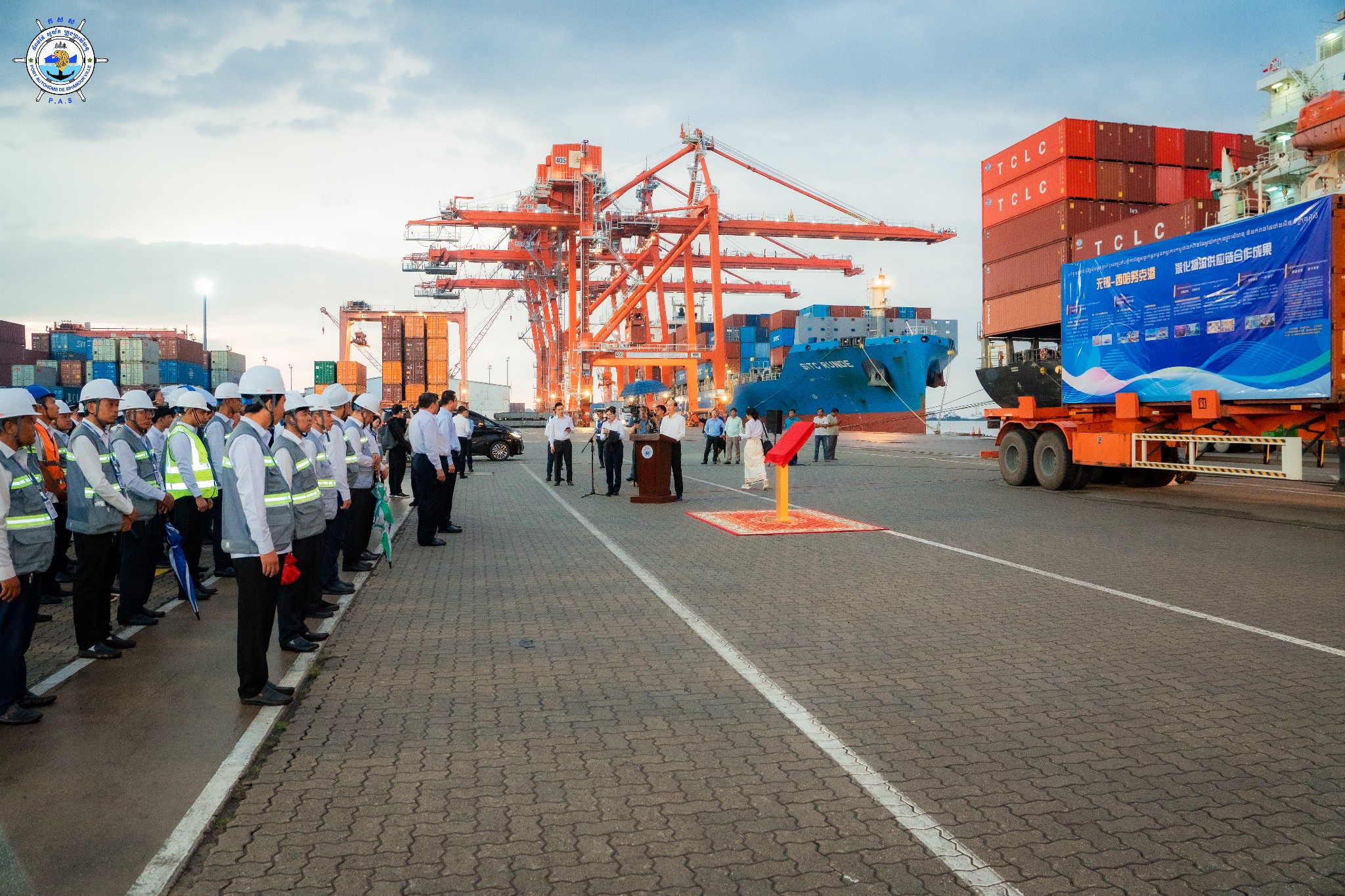 Sihanoukville Autonomous Port (PAS) : At 4:45 PM on Wednesday, 15th October 2025, at the venue of PAS Container Berth Number 7, Sihanoukville Autonomous Port organized A Ceremony Of 500 TEUs Container Throughput Achievement Under A Cooperation Between Sihanoukville Autonomous Port and Jiangyin Port in Wuxi City of the People’s Republic of China, presided over by His Excellency Mang Sineth, Governor of Preah Sihanouk Provincial Municipality, and Mr. Thay Rithy, Deputy Director-General in charge of Business, Representative of His Excellency Lou Kim Chhun, Delegate of the Royal Government of Cambodia in charge as Chairman and CEO of Sihanoukville Autonomous Port, and Mr. Du Xiaogang, Party Secretary of Wuxi City of the People’s Republic of China. This ceremony marks the beginning of potential container throughput increase as a result of port connectivity between PAS and Jiangyin Port in Wuxi City of the People’s Republic of China