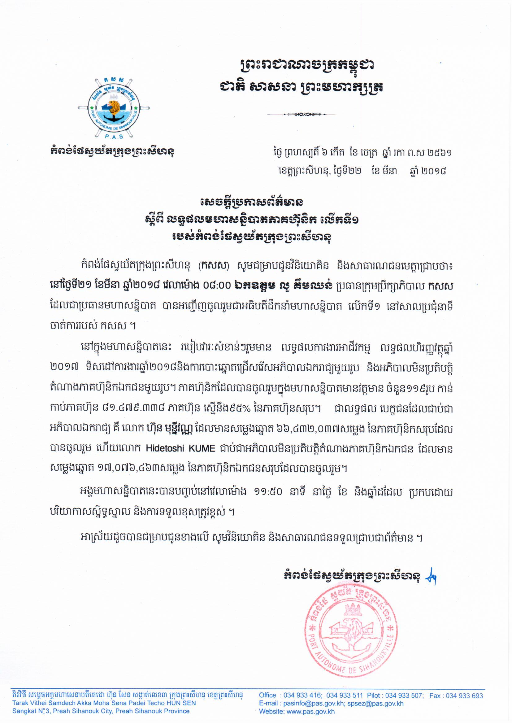 លទ្ធផលមហាសន្និបាតភាគហ៊ុនិក លើកទី១ របស់កំពង់ផែស្វយ័តក្រុងព្រះសីហនុ