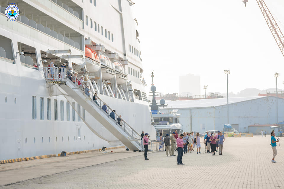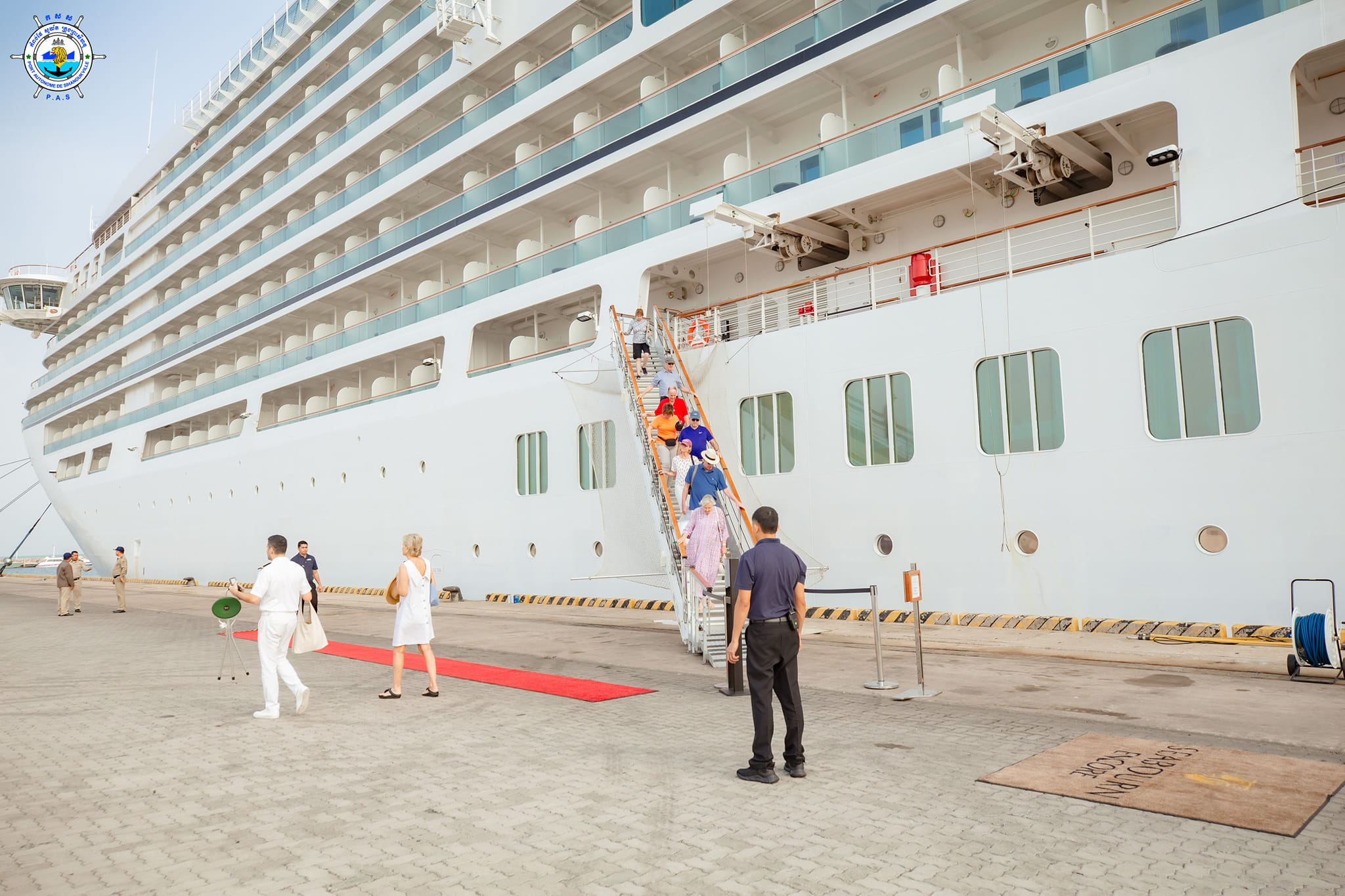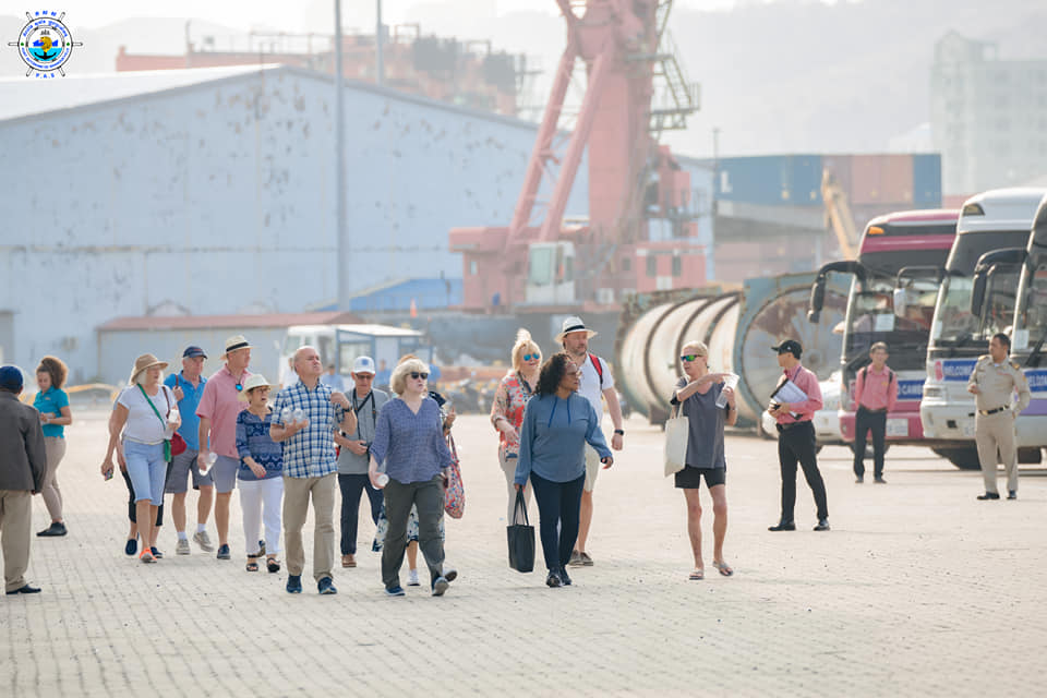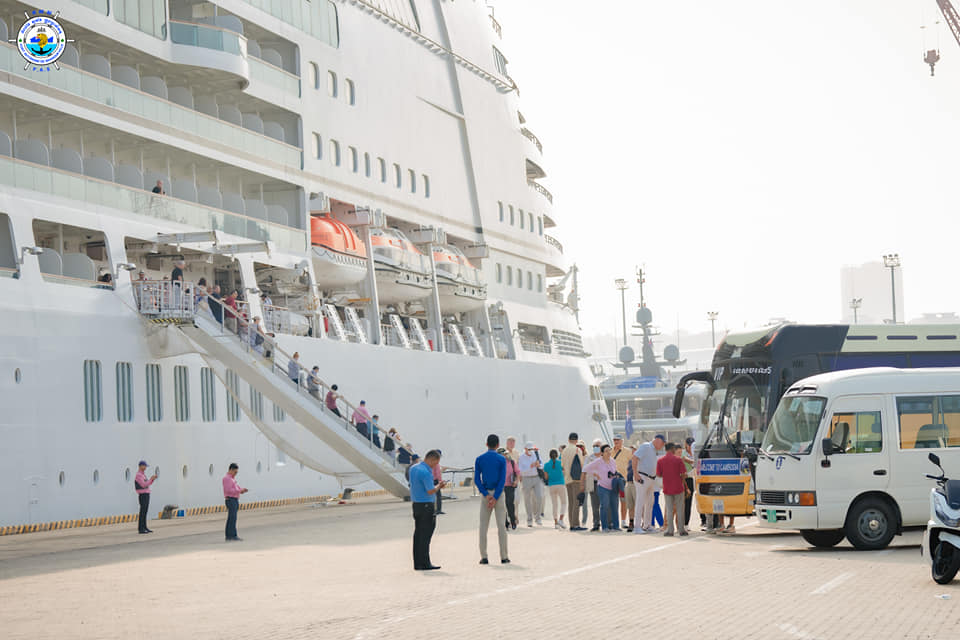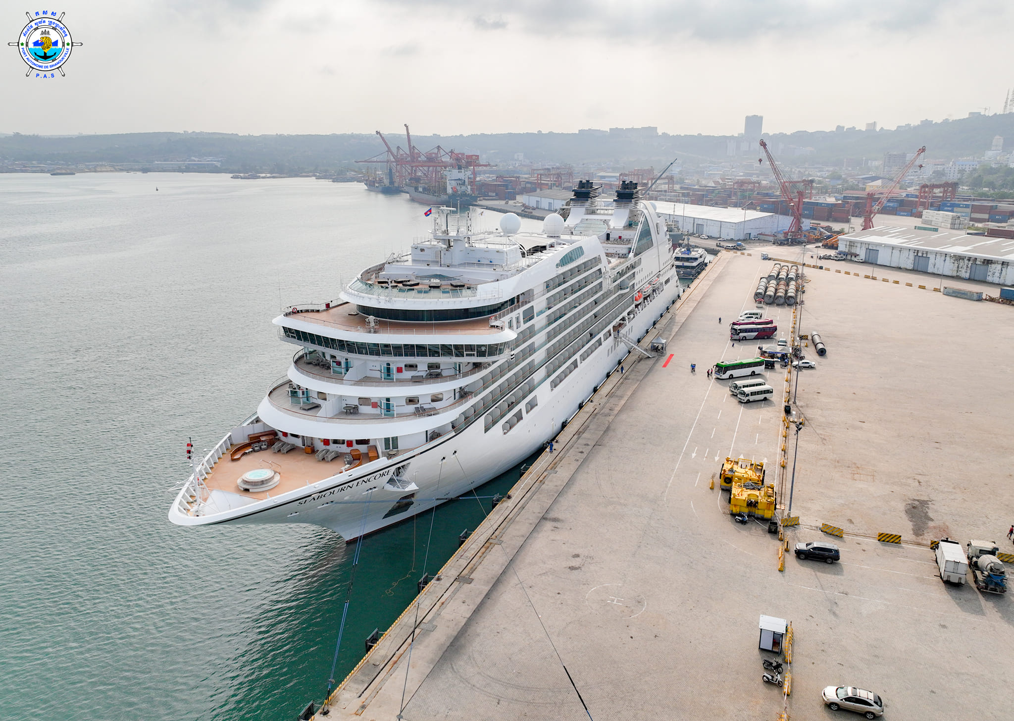 Sihanoukville Autonomous Port (PAS) At 7:50 AM on Saturday, 11th March 2023, Seabourn Encore cruise ship with Bahamas nationality, length of 210.50 meters, width of 28 meters, and depth of -6.60 meters, docked safely at PAS to visit Cambodia for one day after leaving ...
