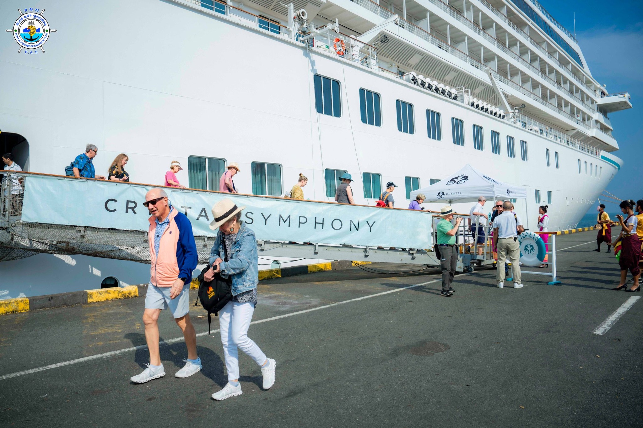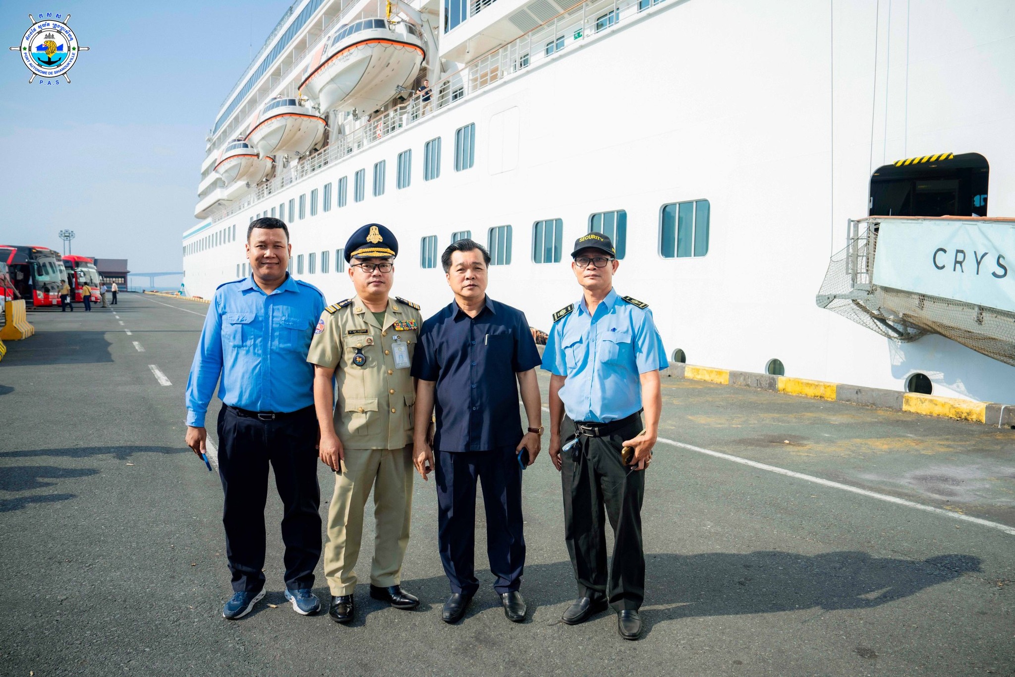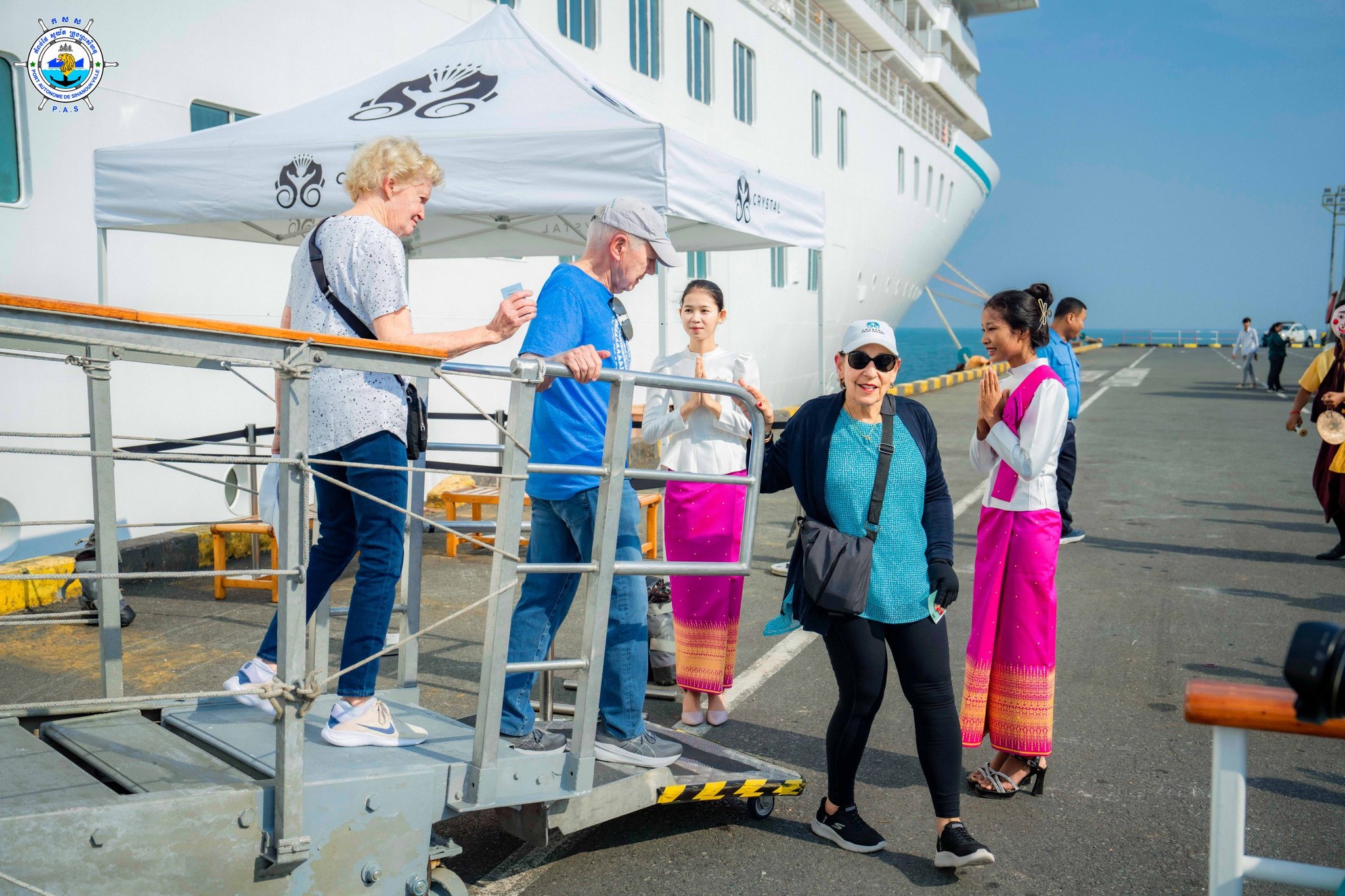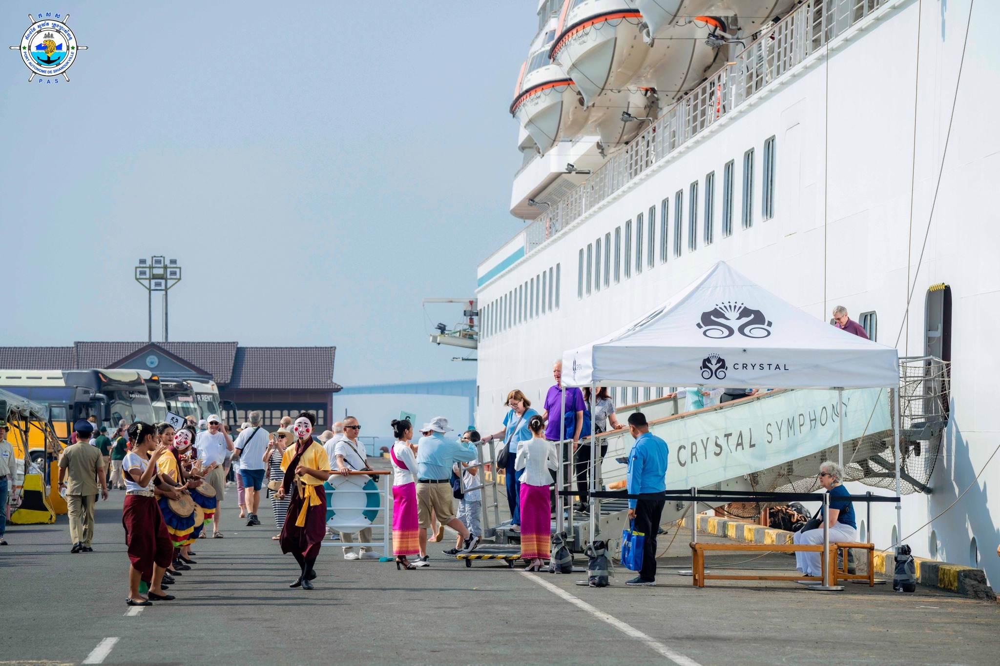 Sihanoukville Autonomous Port (PAS) At 9:00 on Friday, 24th January 2025, CRYSTAL SYMPHONY cruise ship with nationality of BAHAMAS, length of 238.01 meters, width of 30.20 meters, and depth of 7.6 meters, docked safely at PAS to visit Cambodia for one day after leaving Thailand. This cruise ship carries 487 crew members (120 females) with 48 nationalities and 427 passengers (212 females) with 28 nationalities. Most of passengers ‘nationalities are 274 USA and this cruise ship is scheduled to depart for Vietnam at 19:30 on the same date