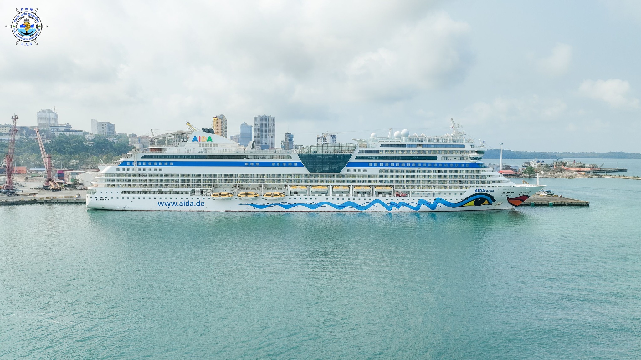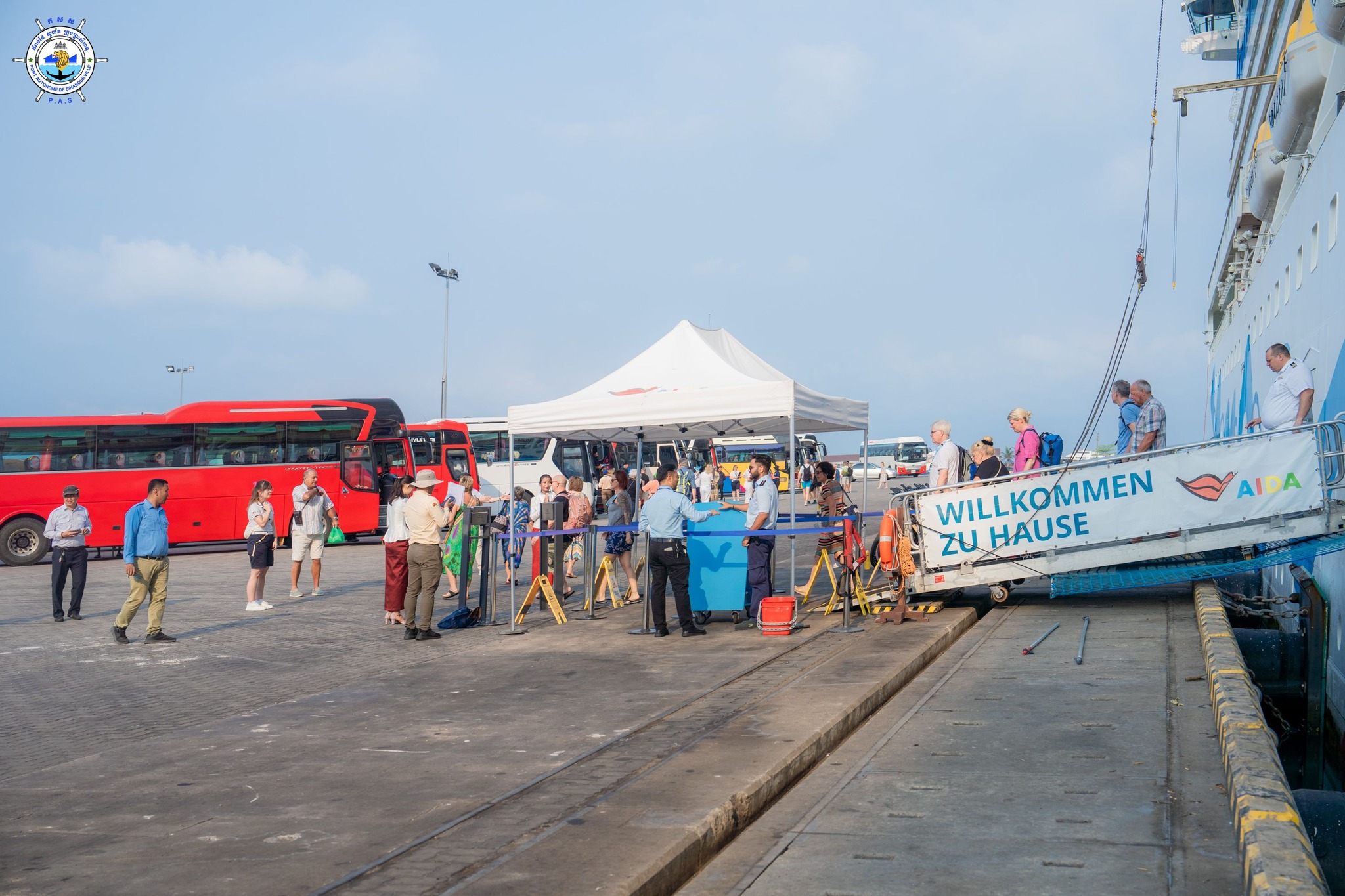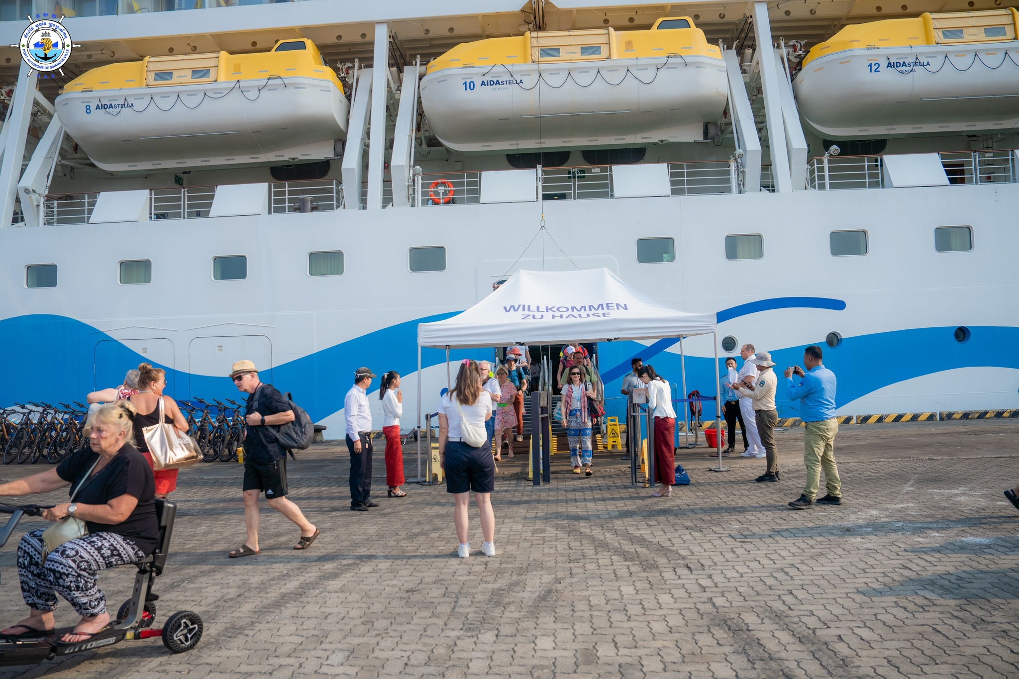 Sihanoukville Autonomous Port (PAS) At 7:30 on Saturday, 15th February 2025, AIDA STELLA cruise ship with nationality of ITALY, length of 253.3 meters, width of 32.2 meters, and depth of 7.3 meters, docked safely at PAS to visit Cambodia for one day after leaving Vietnam. This cruise ship carries 637 crew members (140 females) with 28 nationalities and 2,123 passengers (1,076 females) with 13 nationalities. Most of passengers ‘nationalities are 1,869 GERMANY and this cruise ship is scheduled to depart for Thailand at 18:00 on the same date