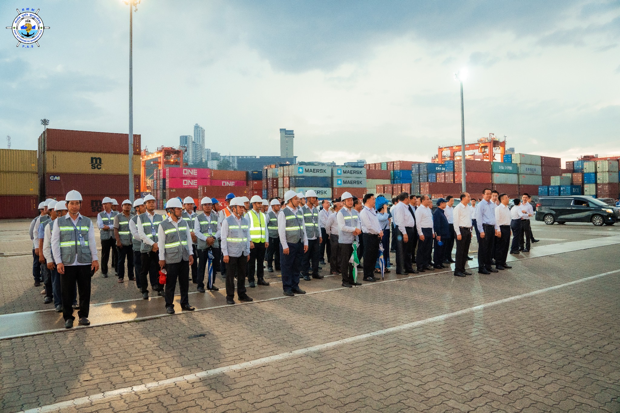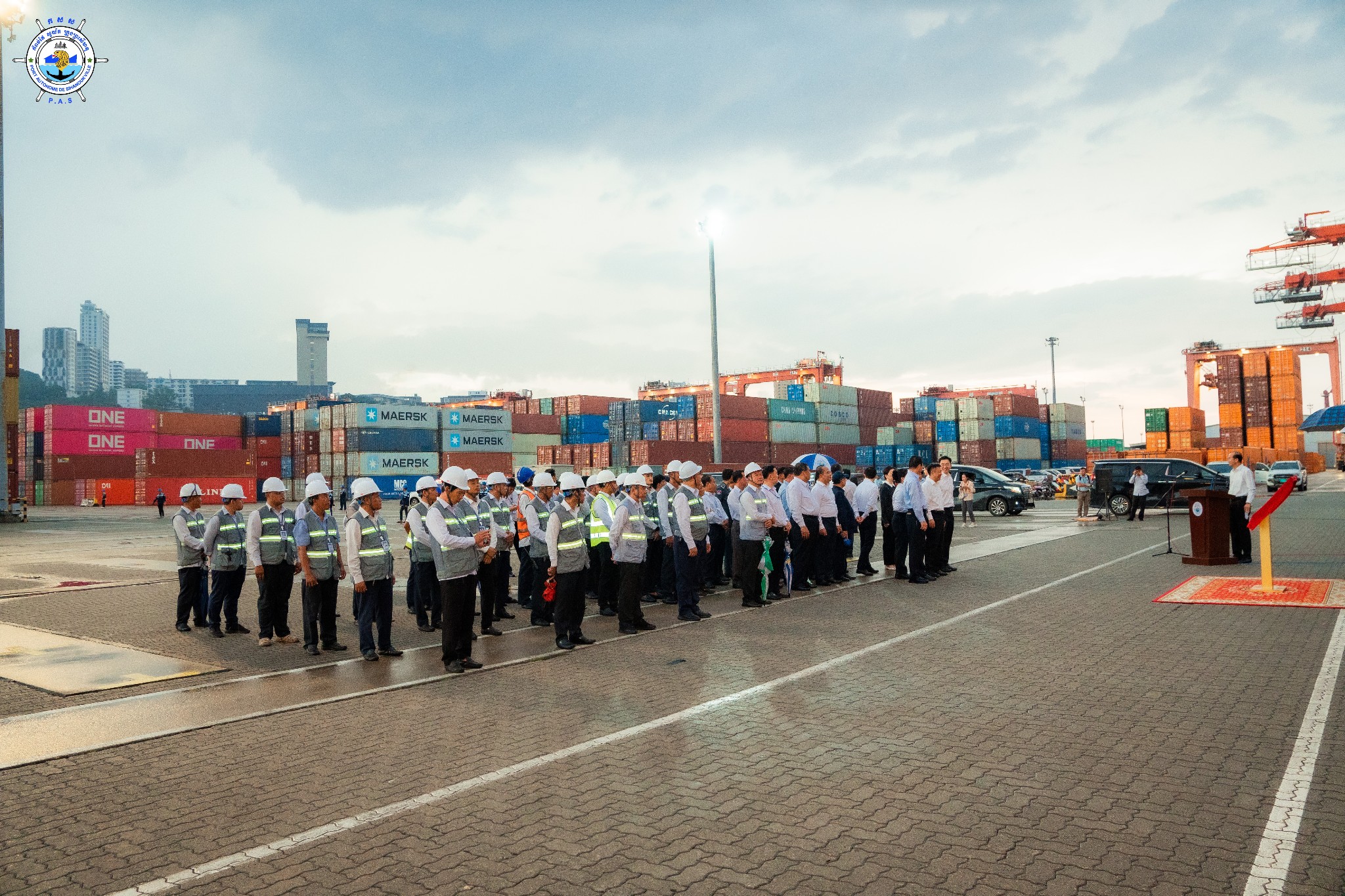 Sihanoukville Autonomous Port (PAS) : At 4:45 PM on Wednesday, 15th October 2025, at the venue of PAS Container Berth Number 7, Sihanoukville Autonomous Port organized A Ceremony Of 500 TEUs Container Throughput Achievement Under A Cooperation Between Sihanoukville Autonomous Port and Jiangyin Port in Wuxi City of the People’s Republic of China, presided over by His Excellency Mang Sineth, Governor of Preah Sihanouk Provincial Municipality, and Mr. Thay Rithy, Deputy Director-General in charge of Business, Representative of His Excellency Lou Kim Chhun, Delegate of the Royal Government of Cambodia in charge as Chairman and CEO of Sihanoukville Autonomous Port, and Mr. Du Xiaogang, Party Secretary of Wuxi City of the People’s Republic of China. This ceremony marks the beginning of potential container throughput increase as a result of port connectivity between PAS and Jiangyin Port in Wuxi City of the People’s Republic of China