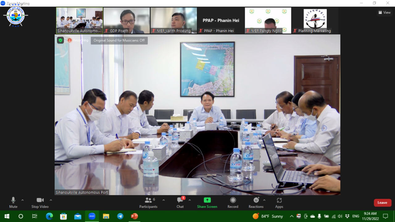 កំពង់ផែស្វយ័តក្រុងព្រះសីហនុ (កសស) នៅវេលាម៉ោង ៩ ព្រឹក ថ្ងៃអង្គារ ៦កើត ខែមិគសិរ ឆ្នាំខាល ចត្វាស័ក ពុទ្ធសករាជ ២៥៦៦ ត្រូវនឹងថ្ងៃទី២៩ ខែវិច្ឆិកា ឆ្នាំ២០២២ នៅសាលប្រជុំតូច កសស លោក ទី សាគុណ អគ្គនាយករង ទទួលបន្ទុកបច្ចេកទេស តំណាង ឯកឧត្តម លូ គឹមឈន់ ប្រតិភូរាជរដ្ឋាភិបាលកម្ពុជា ទទួលបន្ទុកជាប្រធានអគ្គនាយក កំពង់ផែស្វយ័តក្រុងព្រះសីហនុ និងថ្នាក់ដឹកនាំ កសស បានអញ្ជើញចូលរួមកិច្ចប្រជុំពិគ្រោះយោបល់តាមប្រព័ន្ធអនឡាញ Zoom ជាមួយនឹងតំណាងក្រសួងសេដ្ឋកិច្ច និងហិរញ្ញវត្ថុ ស្តីអំពីស្ថានភាពសេដ្ឋកិច្ចកម្ពុជា ដើម្បីជាធាតុចូលសម្រាប់ការវិភាគ និងព្យាករណ៍កំណើនផលិតផលក្នុងស្រុកសរុប (GDP) សម្រាប់ឆ្នាំ២០២២ និងរយៈពេលមធ្យមខាងមុខ។