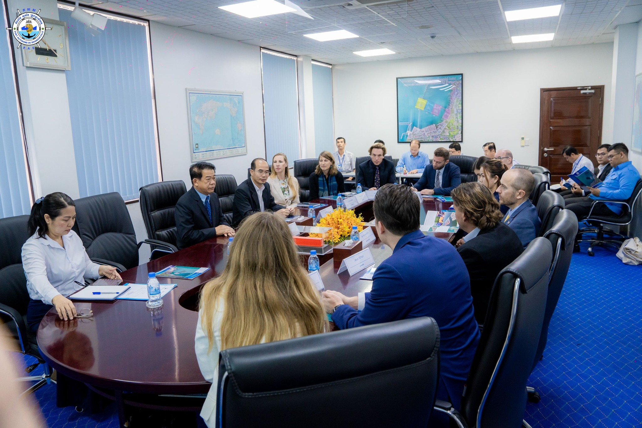 កំពង់ផែស្វយ័តក្រុងព្រះសីហនុ (កសស) ៖ នៅវេលាម៉ោង ១០:៣០ នាទីព្រឹក ថ្ងៃព្រហស្បតិ៍ ៨កើត ខែផល្គុន ឆ្នាំរោង ឆស័ក ពុទ្ធសករាជ ២៥៦៨ ត្រូវនឹងថ្ងៃទី៦ ខែមីនា ឆ្នាំ២០២៥ នៅសាលប្រជុំតូច កសស ឯកឧត្តម លូ គឹមឈន់ ប្រតិភូរាជរដ្ឋាភិបាល ទទួលបន្ទុកជាប្រធានអគ្គនាយក កំពង់ផែស្វយ័តក្រុងព្រះសីហនុ រួមទាំងថ្នាក់ដឹកនាំ កសស បានទទួលស្វាគមន៍ ដំណើរទស្សនកិច្ច គណៈប្រតិភូសហភាពអឺរ៉ុប ប្រចាំព្រះរាជាណាចក្រកម្ពុជា ដឹកនាំដោយ លោក Andreas BERG អនុប្រធានបេសកកម្មការទូត នៃប្រតិភូសហភាពអឺរ៉ុប ប្រចាំព្រះរាជាណាចក្រកម្ពុជា ក្នុងគោលបំណងស្វែងយល់ពី ប្រតិបត្តិការ សក្តានុពល វឌ្ឍនភាព ការអភិវឌ្ឍ និងជាពិសេសទីផ្សារដឹកជញ្ជូនរបស់ កសស។ បន្ថែមលើសពីនេះ មន្ត្រីទូតតំណាងស្ថានទូតរដ្ឋសមាជិក នៃសហភាពអឺរ៉ុប ក៏បានចូលរួមក្នុងដំណើរទស្សនកិច្ចផងដែរ ដែលមកពី ស្ថានទូតអាល្លឺម៉ង់ បារាំង ឆេក អូទ្រីស ប៉ូឡូញ ហ្វាំងឡង់ ស៊ុយអ៊ែត ហូឡង់ និងស្លូវិននៀ