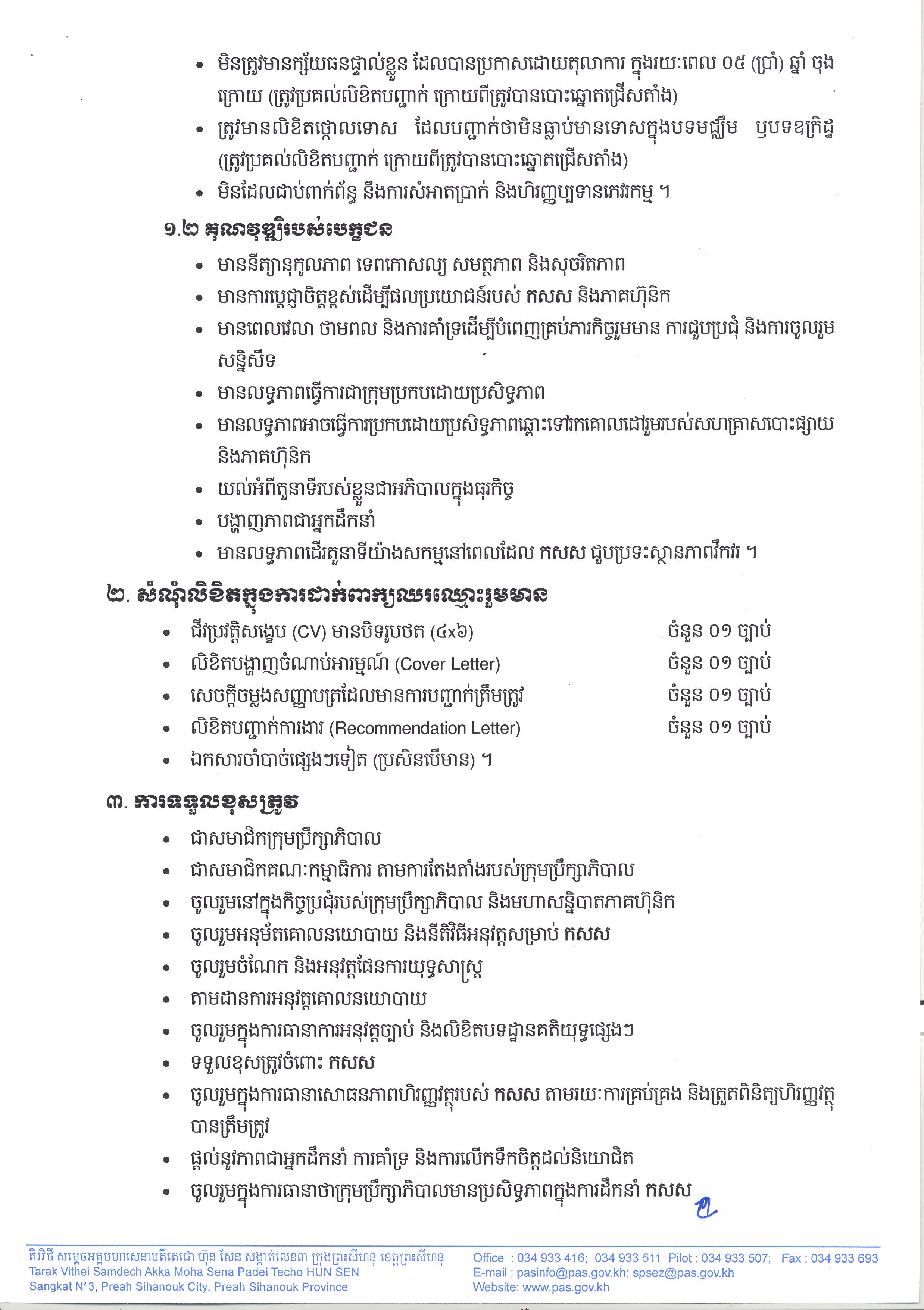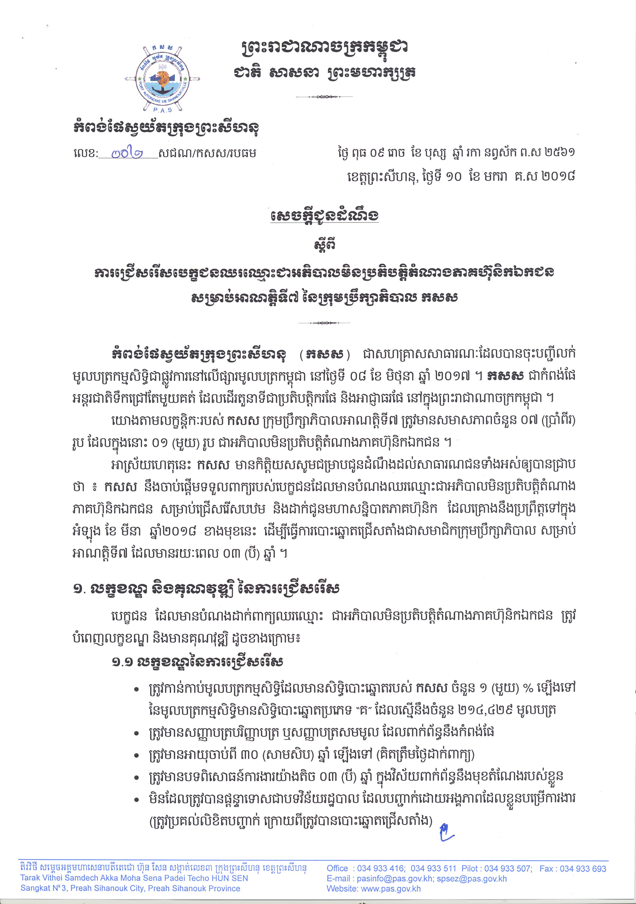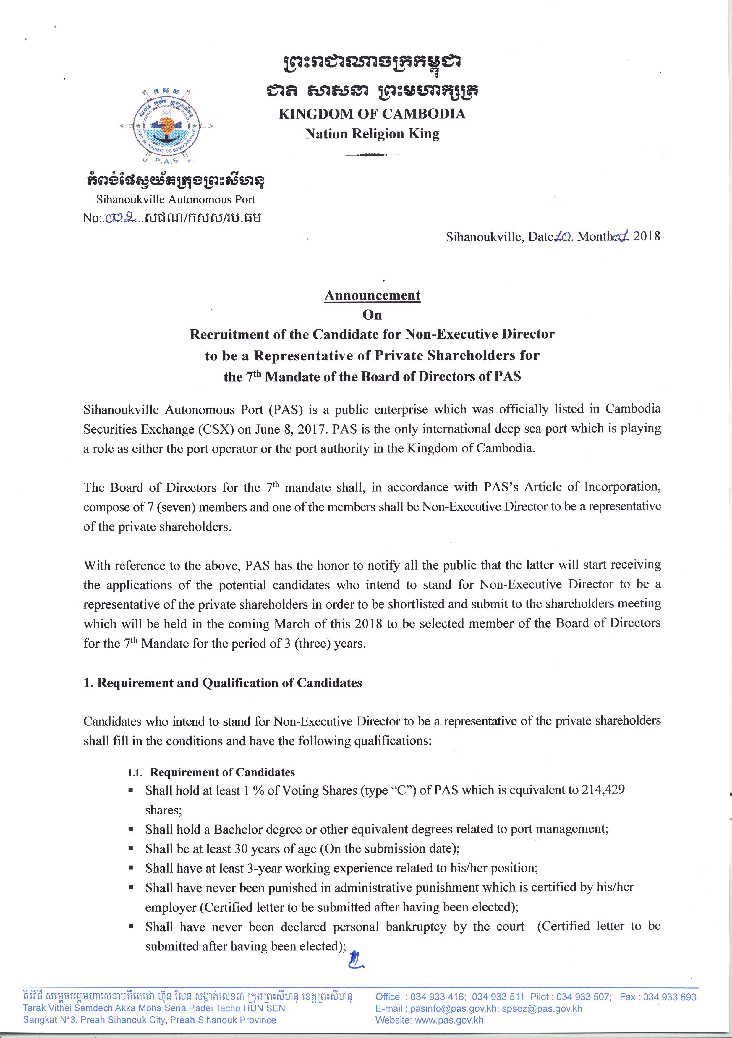 ស្ដីអំពី ការជ្រើសរើសបេក្ខជនឈរឈ្មោះជាអភិបាលមិនប្រតិបត្តិតំណាងភាគហ៊ុនិកឯកជន សម្រាប់អាណត្តិទី ៧ នៃក្រុមប្រឹក្សាភិបាល កសស ។ On Recruitment of the Candidate for Non-Executive Director to be a Representative of Private Shareholders for the 7th Mandate of the Board of Directors of PAS.