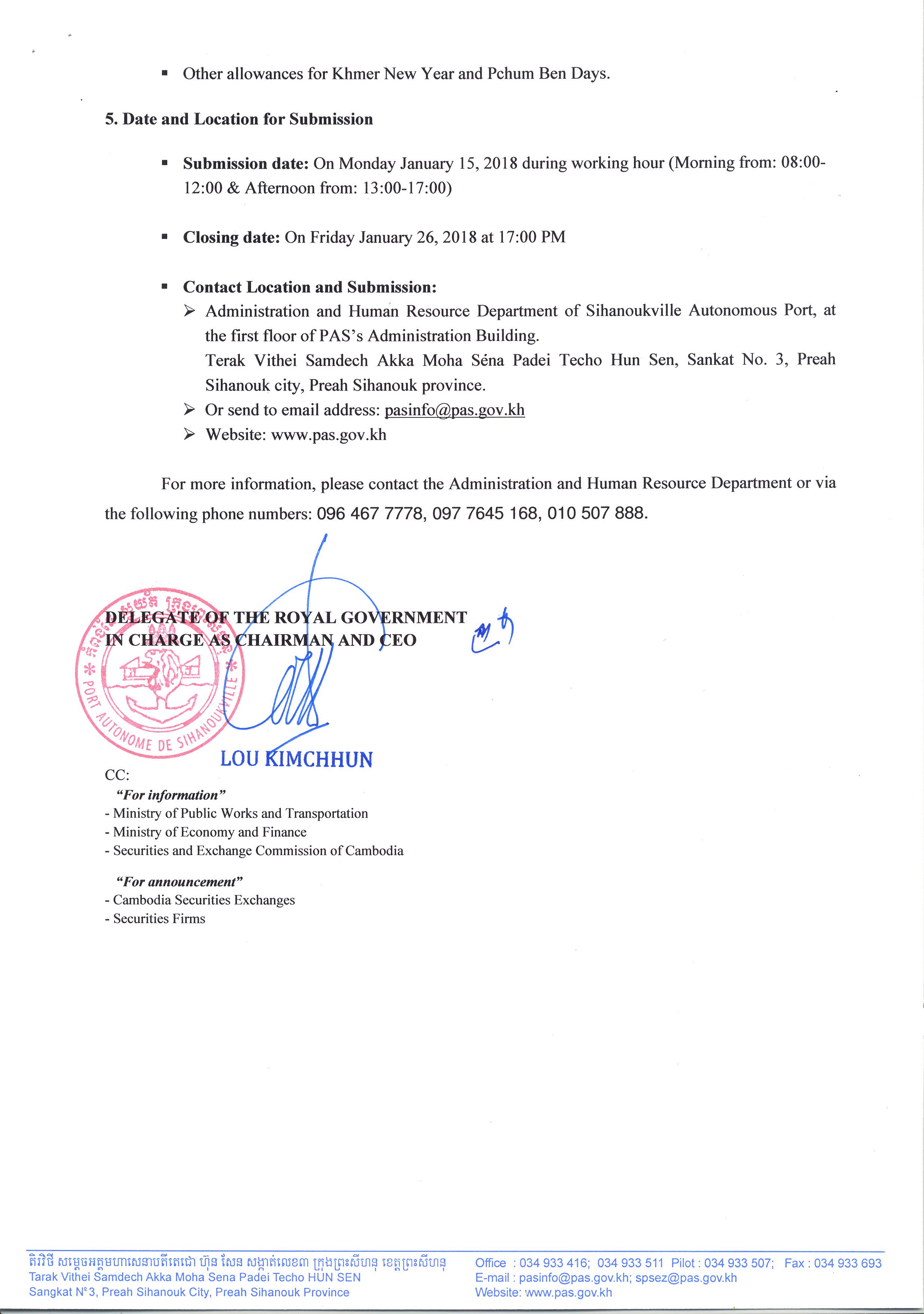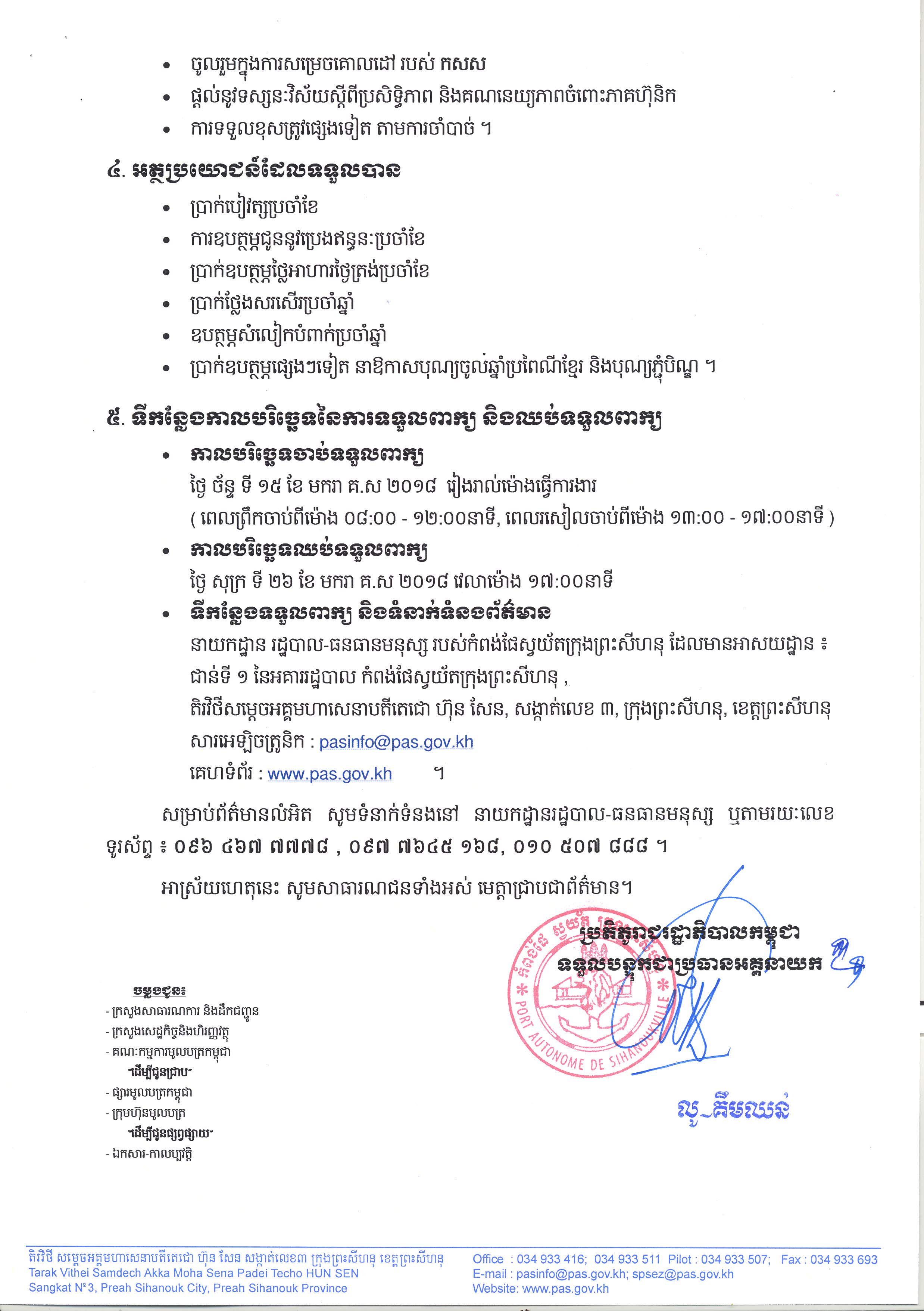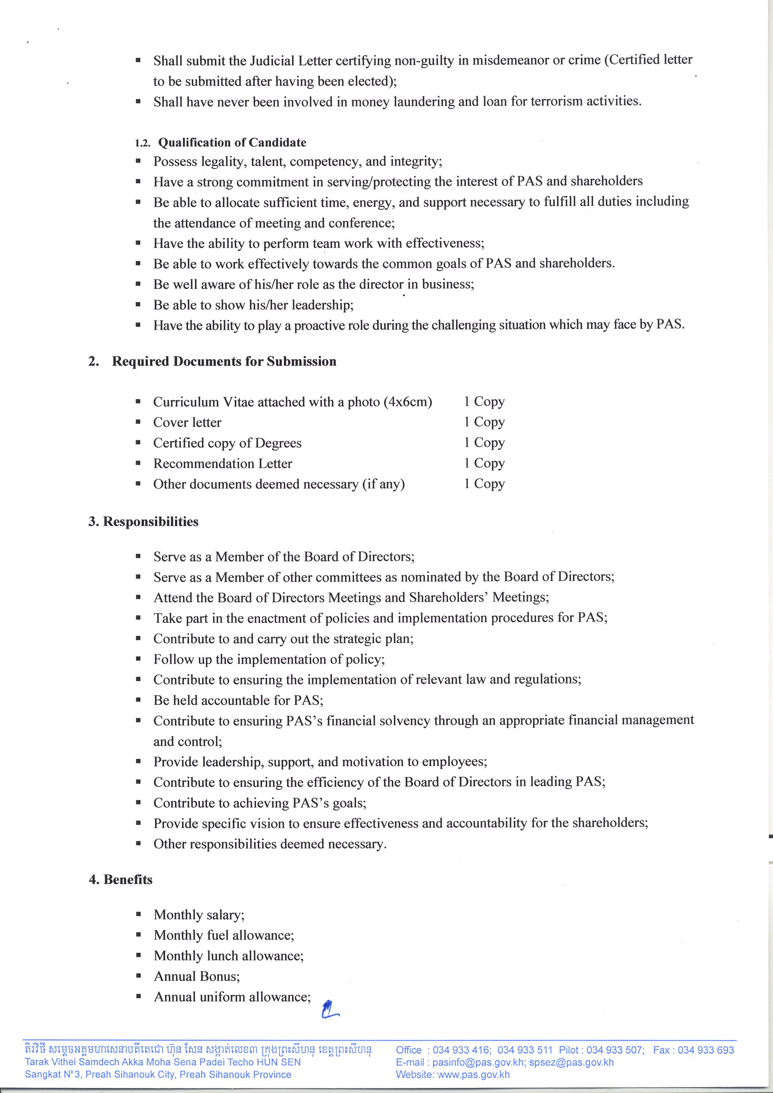 ស្ដីអំពី ការជ្រើសរើសបេក្ខជនឈរឈ្មោះជាអភិបាលមិនប្រតិបត្តិតំណាងភាគហ៊ុនិកឯកជន សម្រាប់អាណត្តិទី ៧ នៃក្រុមប្រឹក្សាភិបាល កសស ។ On Recruitment of the Candidate for Non-Executive Director to be a Representative of Private Shareholders for the 7th Mandate of the Board of Directors of PAS.