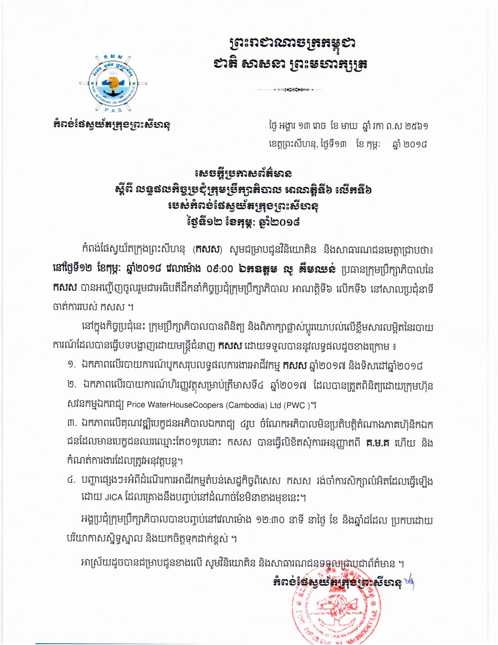 សេចក្ដីប្រកាសព័ត៌មានស្ដីពី លទ្ធផលកិច្ចប្រជុំក្រុមប្រឹក្សាភិបាល អាណត្តិទី៦ លើកទី៦ របស់កំពង់ផែស្វយ័តក្រុងព្រះសីហនុ (កសស) កាលពីថ្ងៃទី១២ ខែកុម្ភៈ ឆ្នាំ២០១៨