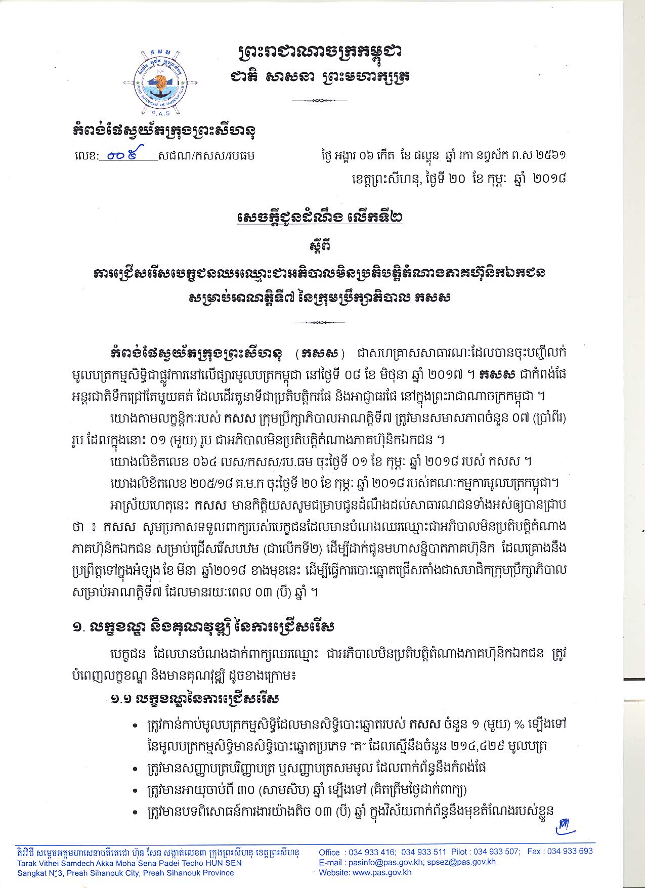 សេចក្ដីជូនដំណឹងលើកទី ២ ការជ្រើសរើសបេក្ខជនឈរឈ្មោះជាអភិបាលមិនប្រតិបត្តិតំណាងភាគហ៊ុនិកឯកជន