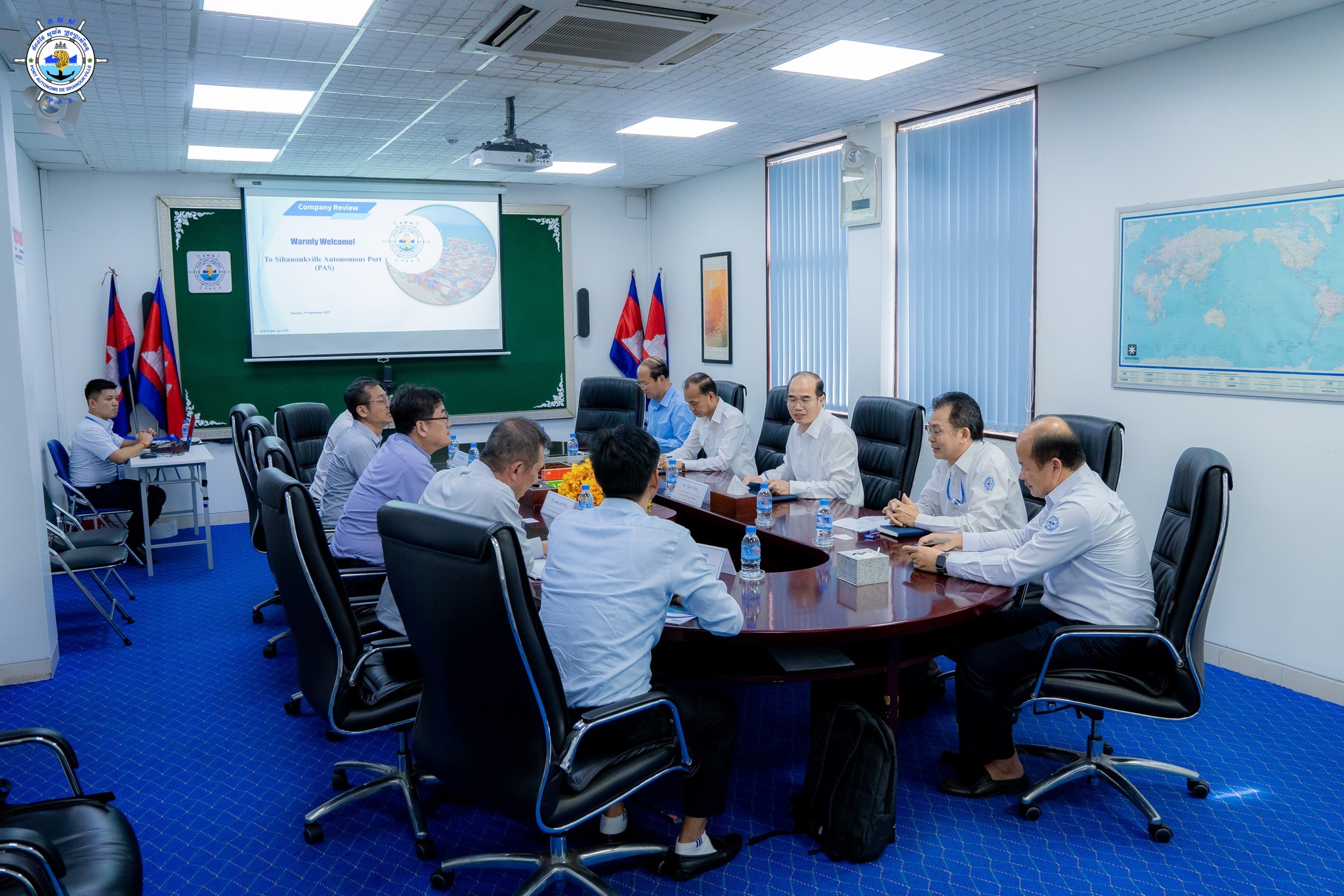 Sihanoukville Autonomous Port (PAS) : At 2 PM on Wednesday, 03rd September 2025, at the venue of PAS Meeting Room, Mr. Thay Rithy, Deputy Director-General in charge of Business, Representative of His Excellency Lou Kim Chhun, Delegate of the Royal Government of Cambodia in charge as Chairman and CEO of Sihanoukville Autonomous Port and PAS Management Team, held a discussion meeting with Inchcape Shipping Services (Cambodia) Ltd., led by Mr. Lim Heang, General Manager of Inchcape Shipping Services (Cambodia) Ltd., accompanied by HMM (SG) Pte. Ltd., led by Mr. Jeong Jae Woo, Senior Vice President of HMM (SG) Pte. Ltd., regarding port's process of vessel calling, berth capacity and availability, and future development plan